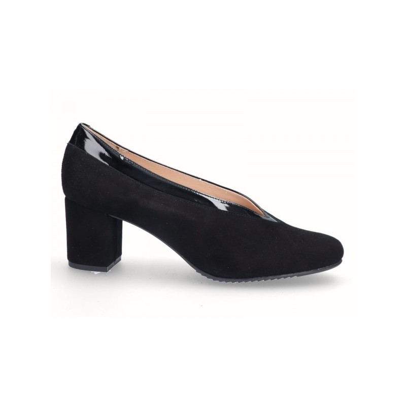 Zapato elegante en piel ante con detalle en piel charol,escote en forma de V. Color negro. Forro y plantilla de piel.Piso antideslizante.Altura 6 cms aprox. Hecho en España.