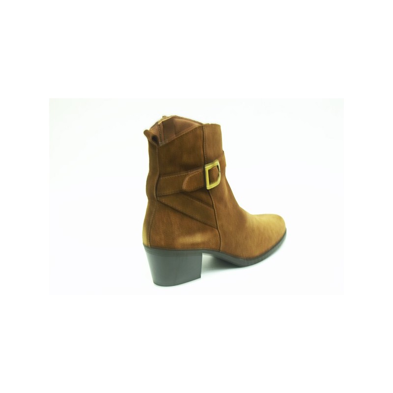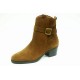 Botín en serraje con hebilla de adorno. Color castaña. Tacón 6, piso 1 cms aprox. Hecho en España.