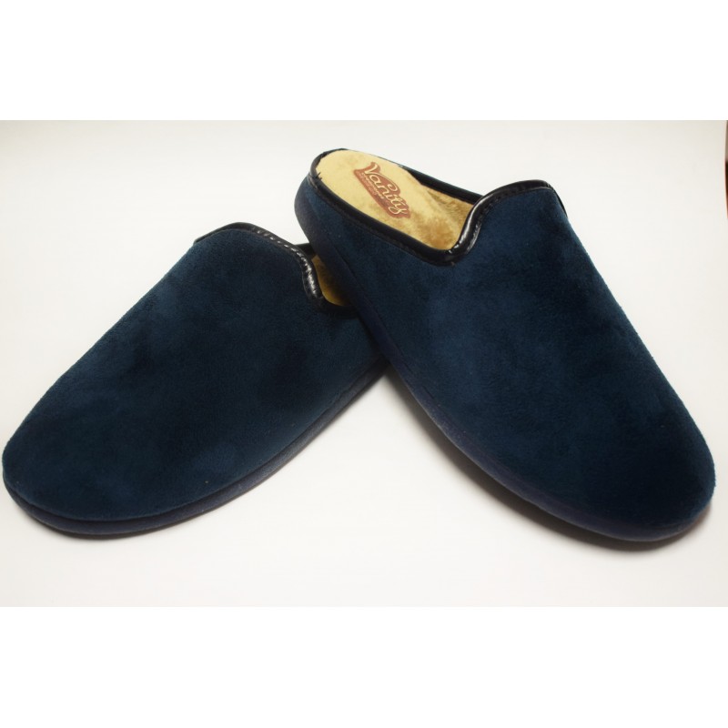 Zapatilla chinela de casa con exterior en tacto ante azul e interior cálido en color beig.