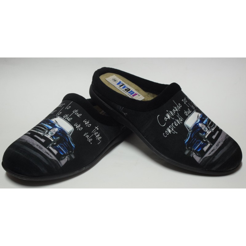 Zapatilla chinela en tono negro,con dibujo de coche. Cómoda y flexible.